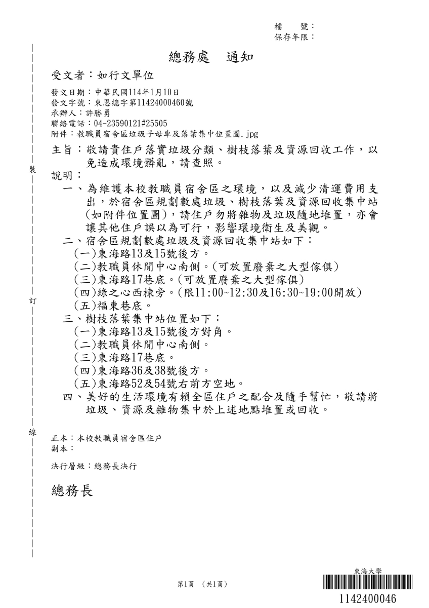 教職員宿舍區垃圾、資源及樹枝落葉回收集中站通知
