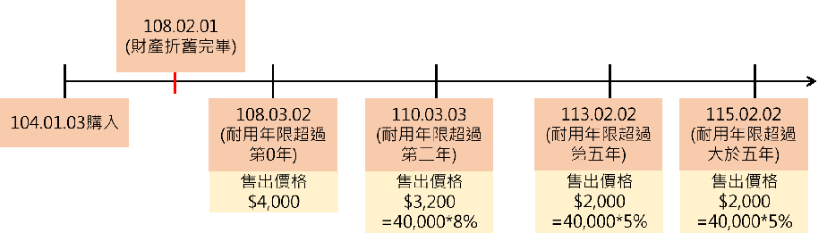 筆記型電腦於104年1月3日購入,購入價格40,000元,耐用年限4年,財產購置原價之10%為4,000元。(超過第一年依財產購置金額百分之十,計算購買價格,期後每過一年,逐年遞減百分之一,最低至百分之五)